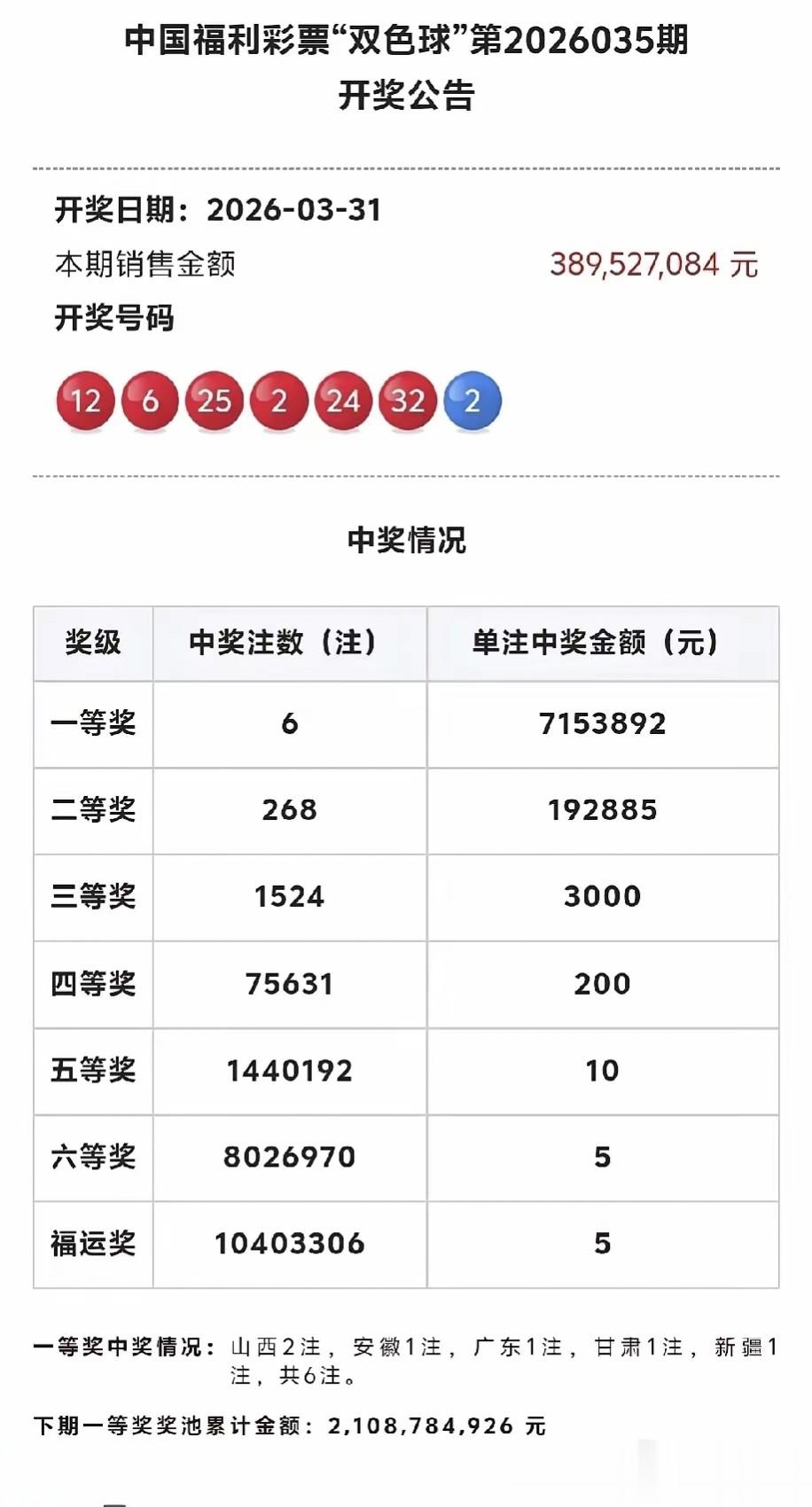 中国福利彩票“双色球”第 2026035 期于2026 年 3 月 31 日晚开奖。本期开出红球号码12、06、25、02、24、32,蓝球号码02。全国共中出6 注一等奖,单注奖金高达715 万余元,下期奖池累计金额超过21 亿元。