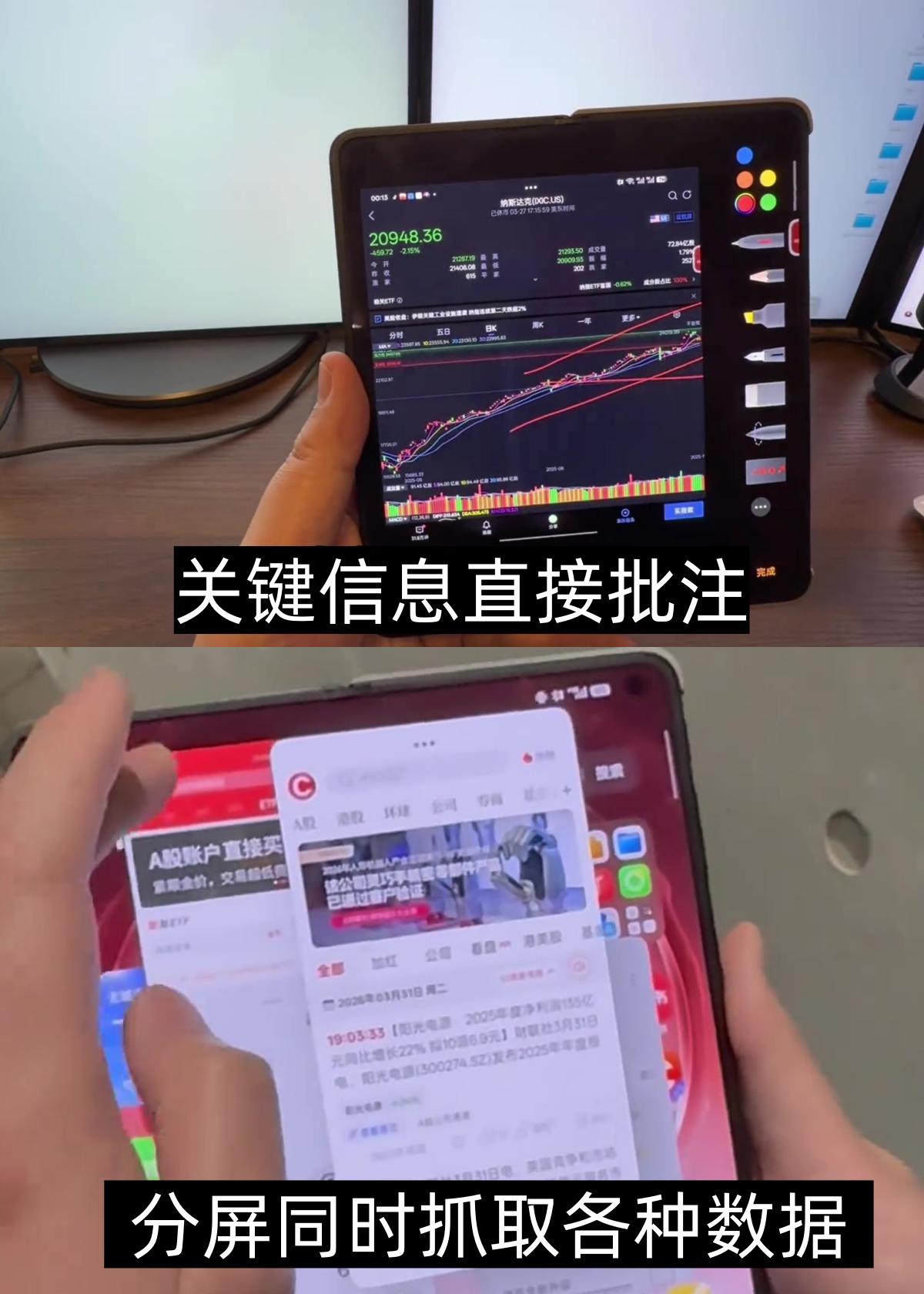 而且要不怎么说专业的人干专业的事呢,还给他们找出了更多用法,像看盘的时候直接就标注了,信息抓取一个分屏or小窗就搞定,都不怕切屏就忘了的!还有AI手写笔还能火速搞定各种数据图表