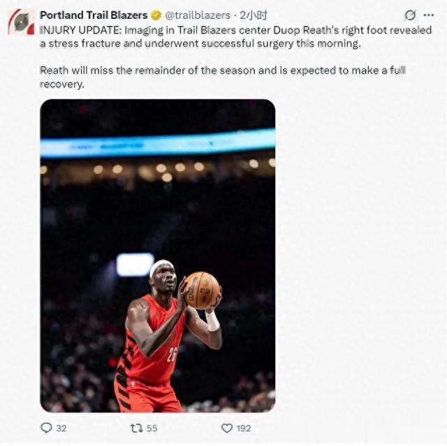 真是怕什么来什么!北京时间1月30号一大早,波特兰开拓者那边传来了个让人揪心的消息:咱们的老熟人、中锋杜普-里斯因为右脚应力性骨折,刀都挨了,直接躺平进手术室。这回伤得不轻,本赛季肯定是没戏了,就连下个赛季的开头也得跟着歇菜。俗话说“福无双至,祸不单行”,这已经是本赛季第二个倒在这种病上的NBA中锋了,前脚独行侠的莱夫利刚倒下,后脚里斯就跟上,这该死的应力性骨折简直就是大个子们的“阿喀琉斯之踵”,当年大姚也就是栽在这上面才不得不早早挂靴的。