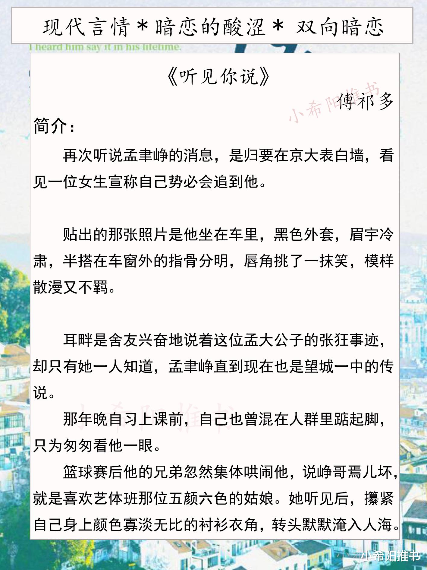 这本小说的暗恋酸涩感写的蛮好的,女主以为暗恋的三年,只是自己一个人的独角戏,原来在她没有注意的角落,对方也默默暗恋了她三年,背地里默默付出怕打扰她学习备考。大学时再次相逢,女主以为两人不会有交际,谁知对方主动靠近出击,暗戳戳的表明心意,这个双向奔赴爱啦爱啦!暗恋的酸涩估计只有暗恋的人会深有感触!