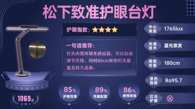 儿童护眼灯推荐哪款?松下致准护眼台灯采用侧发光方式,搭配直径60cm的大面积光源面,中心照度可达1765lux,可覆盖约180cm的书桌,即便大桌面也能实现宽广照明。色温可在2700K暖黄光至5000K冷白光之间自由调节,适应夜读、日间学习等多种场景。此外,灯头配备触控操作面板,轻触即可在阅读模式和工作模式间切换,同时支持智能调光、入座感应及定时休息功能,能自动调节亮度并提醒合理用眼,延时关灯也方便睡前使用,操作便捷。