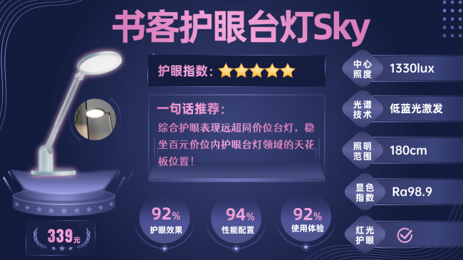 “护眼与亮度不可兼得”曾是护眼台灯行业的默认设定,但书客sky拒绝接受这套传统且老旧的逻辑,开创了独一份的专研SunSilk™护眼芯片和5域环控光学系统,通过高密度导光板+多层扩散膜组合,消除光源颗粒感,柔化发光点,减少瞳孔收缩应激;配合DT多维漫射2.0技术,通过多角度漫射导光板,高度模拟太阳光从天空穿透大气层再经地面反射的自然扩散过程,实现全桌面均匀照明,打造真正接近自然光的安全光环境。同时在核心的护眼养眼方面,书客创新地研发了RRT2.0红光养眼技术,加入低照度红光护理,科学激活眼底线粒体活性,缓解长时间近距离用眼导致的干涩疲劳。并且还运用了硬件级低蓝光技术,实现软硬兼施的效果,精准过滤400-455Nm有害蓝光,增强有益红光,实现百元价位旗舰级护眼表现。