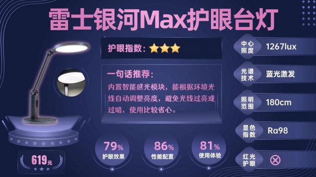 儿童护眼灯推荐哪款?雷士银河MAX它采用侧发光和上下双向投光技术,能有效减少光线的对比度,使用舒适。它的中心照度为1267lux,照明范围大约180cm,适合较大的桌面,能够满足日常的阅读和写作需求。这款台灯支持3000K到5000K的无极色温调节,可以根据不同的场景调节光线,确保舒适的视觉体验。同时智能方面,它配备了雷达入座感应、智能调光和定时休息提醒等功能,使用起来非常便捷,自动调节亮度,避免眼睛疲劳。