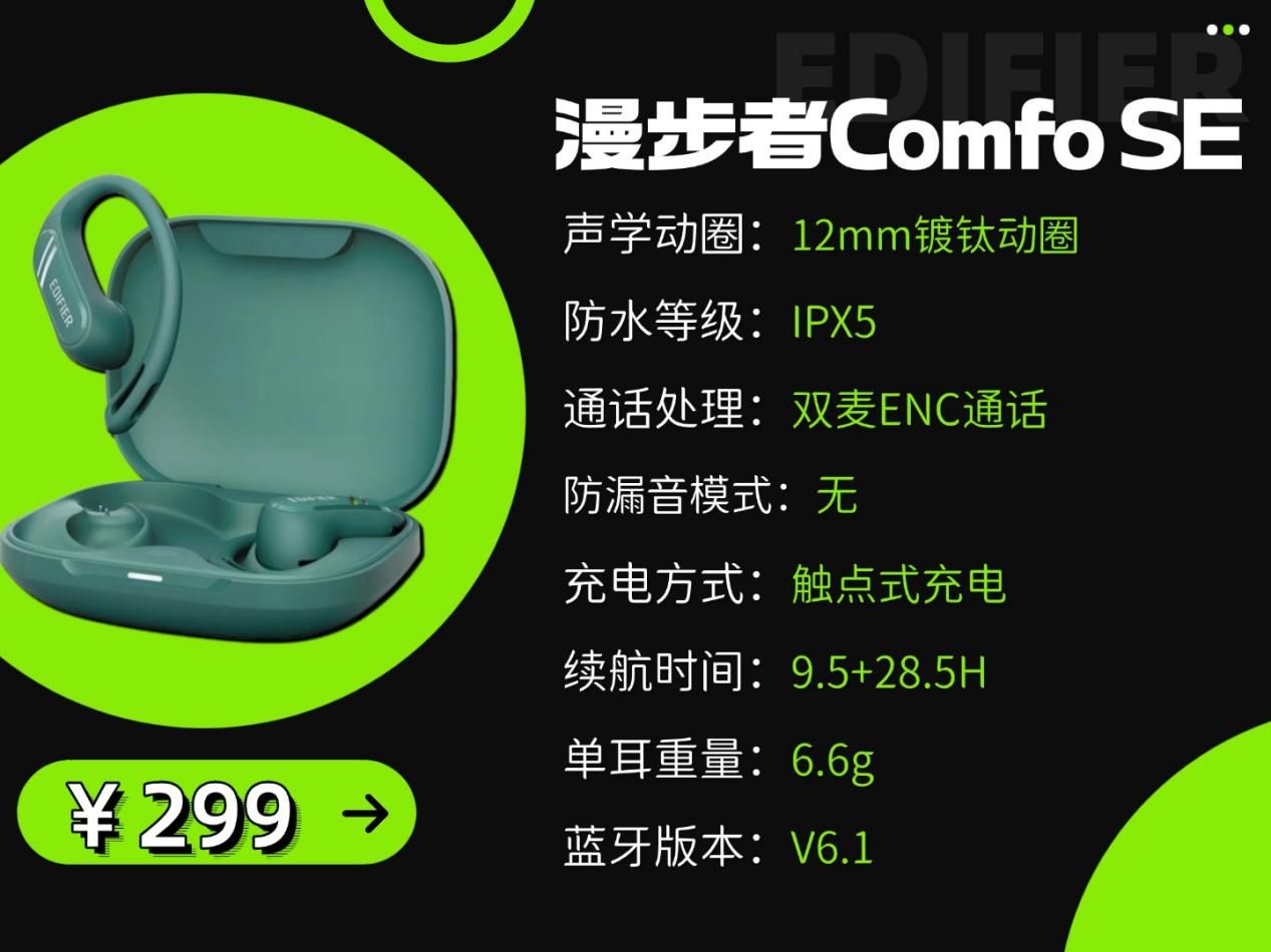 漫步者 Comfo SE 整体表现均衡稳定,没有花里胡哨的功能, but日常使用的核心需求全都能满足,特别适合第一次买开放式耳机的新手。