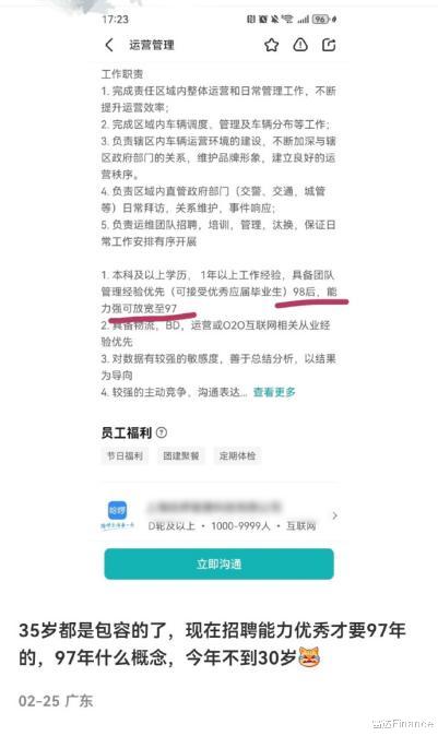 据极目新闻2月27日消息,2月25日,IP归属属地为广东的一名网友发布截图显示,哈啰普惠在招聘“运营管理”岗位时,除了对学历、工作经验、个人能力等进行要求外,还限制“98后,能力强可放宽至97”。