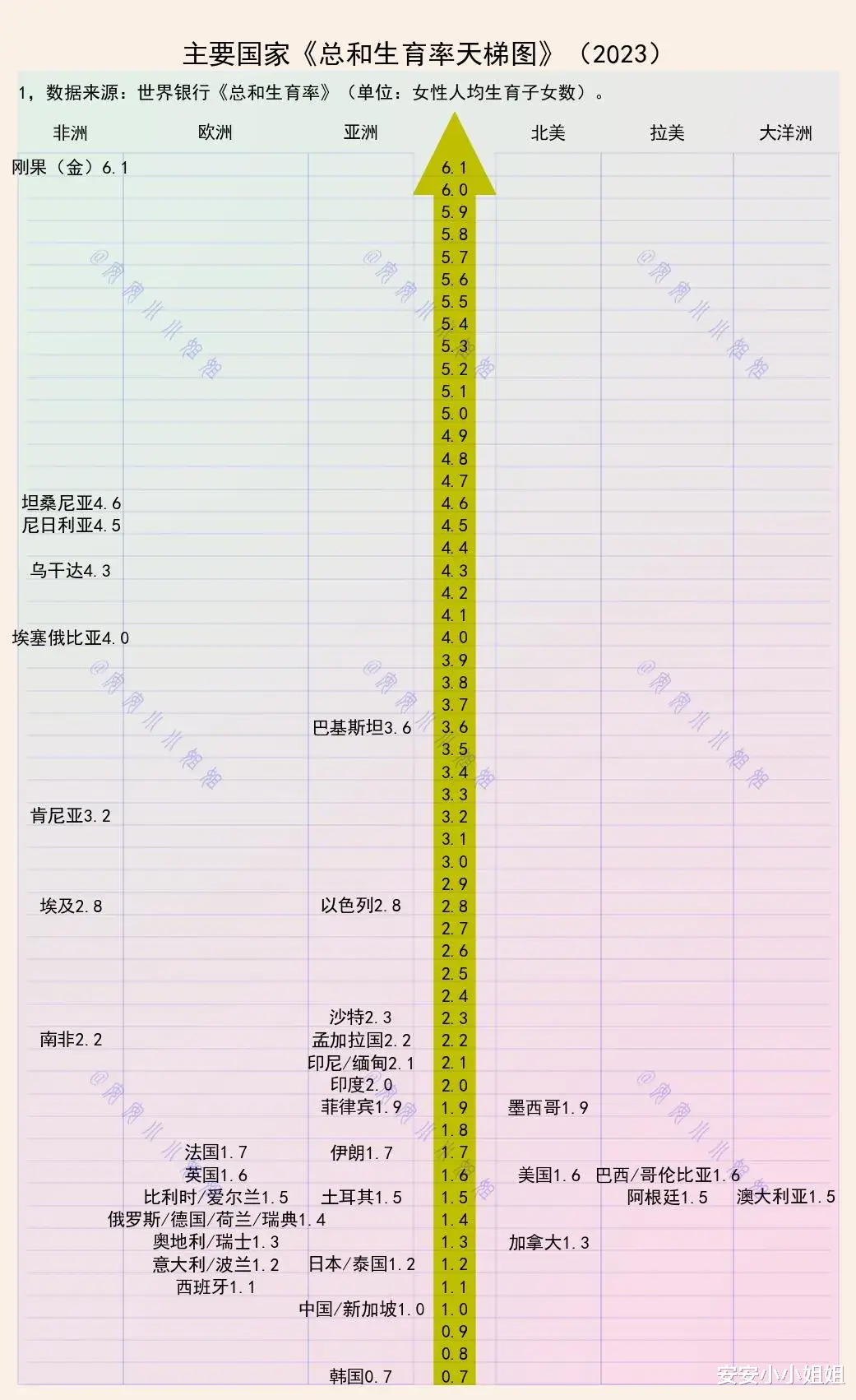 根据世界银行2023年的数据,全球主要国家的总和生育率呈现出巨大的地理差异,描绘出一幅清晰且引人深思的世界人口图景。