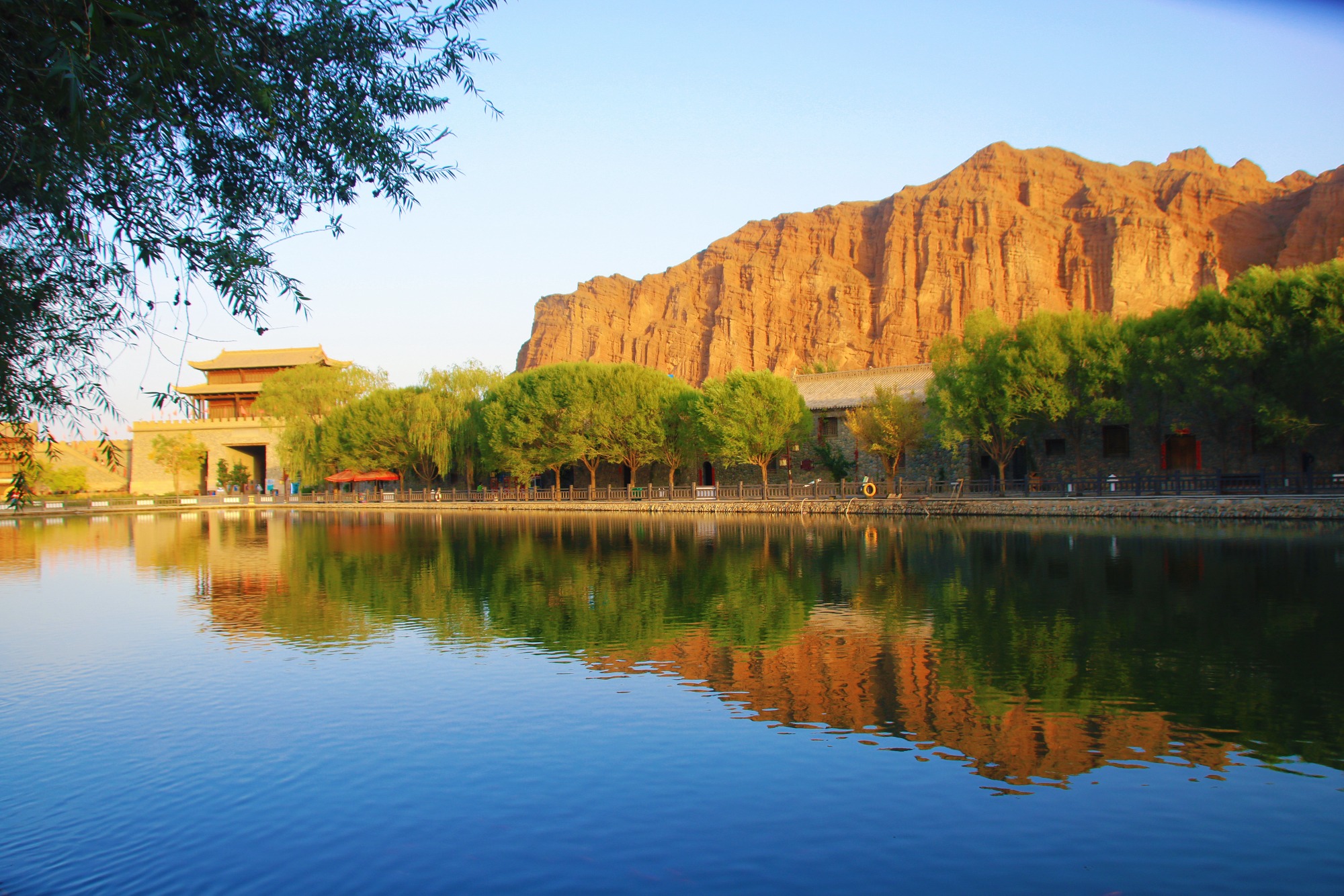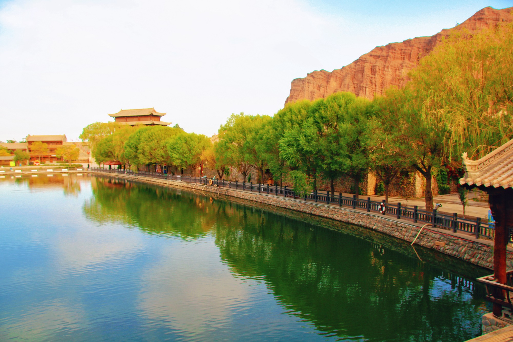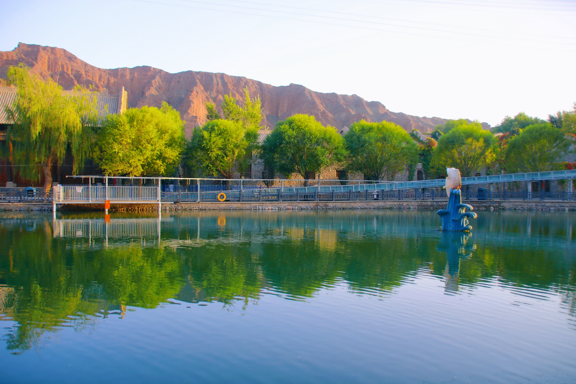 在小镇里随意闲逛,总有一泓碧水伴在身边,平静的湖水仿佛一面镜子,水岸被茂盛的绿树环绕,眼前的景色会让人忘记此时竟是在“大漠孤烟直”的西北。