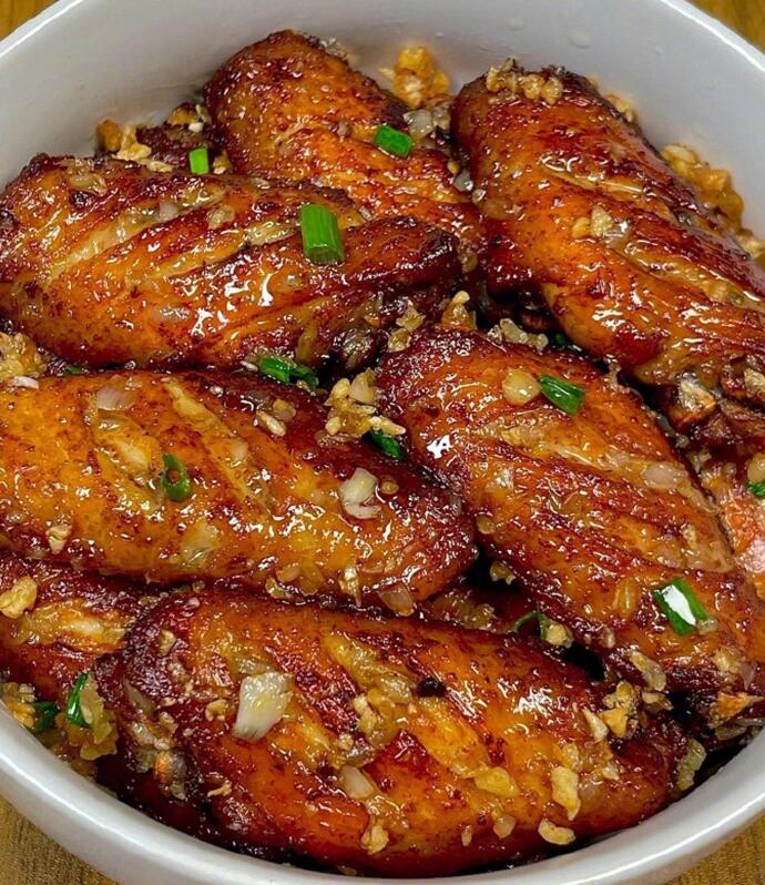 把做好的蒜香鸡翅盛出来,放在盘子里,那金黄的鸡翅上裹着一层浓郁的酱汁,还散发着阵阵蒜香。夹起一块放进嘴里,外皮焦脆,里面肉质鲜嫩多汁,蒜香和鸡肉的香味在嘴里交织,简直是人间美味。
