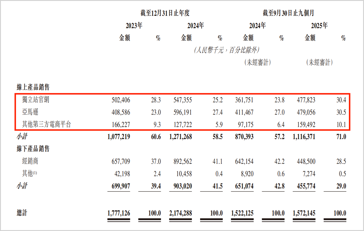 由于需直面消费者,企业必须持续投入大量资金用于社交媒体运营、达人合作、广告投放及独立站维护。招股书显示,2023年至2025年前三季度,德兰明海销售开支占同期收入的比重分别达35.0%、26.5%和30.5%,持续处于高位,显著侵蚀利润空间。