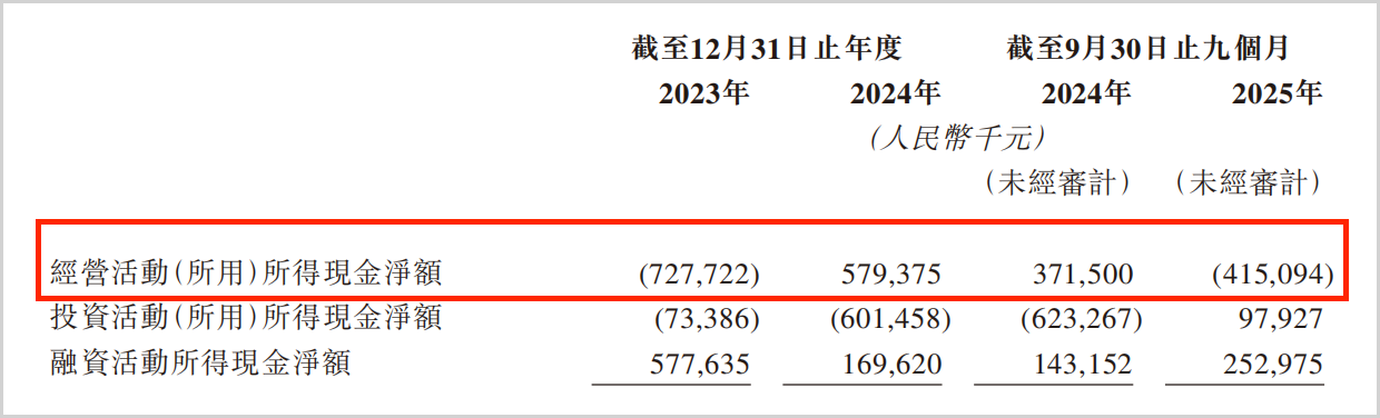 在持续“烧钱扩张”的战略下,德兰明海的资金状况并不宽裕。招股书数据显示,2023年、2024年及2025年前三季度,公司经营活动现金流净额分别为-7.28亿元、5.79亿元和-4.15亿元。
