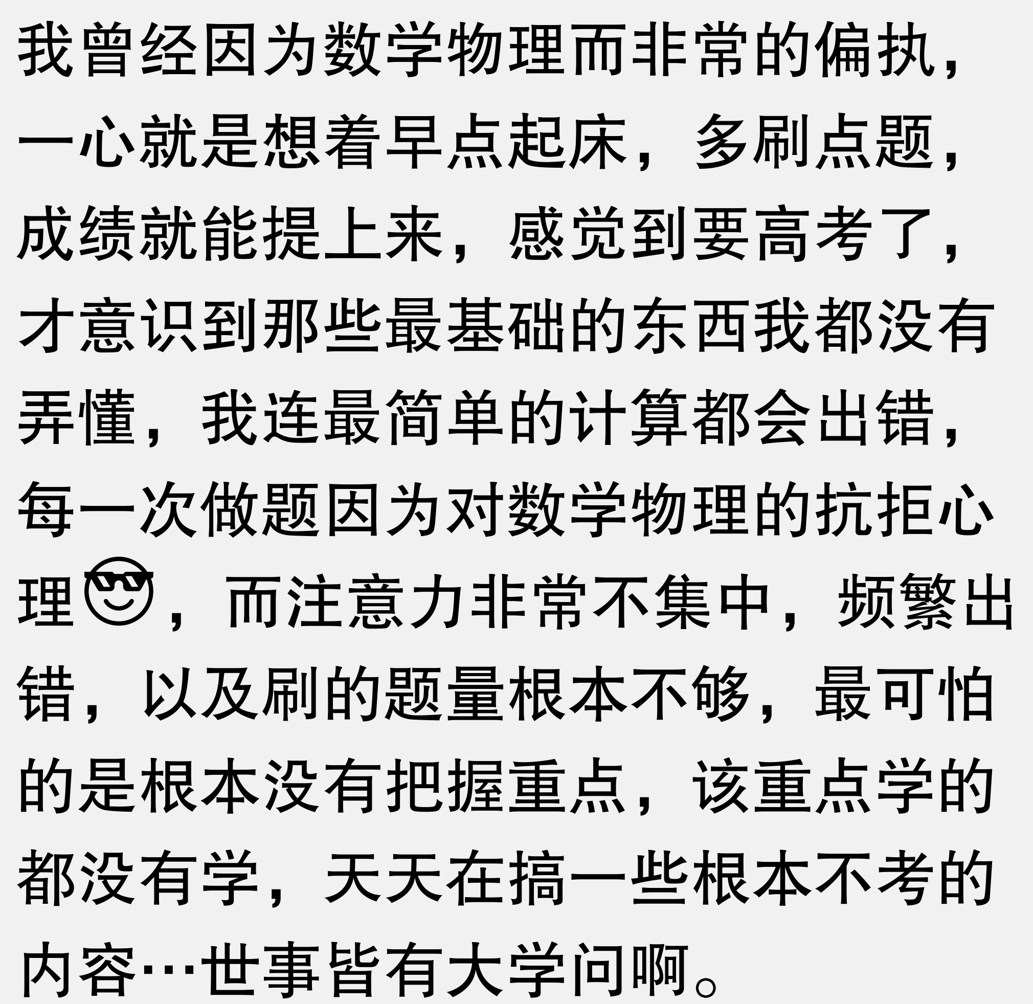 超级好的回答,感觉一下子堵了十年的脑血栓通了,我从未见过有人把这堵墙描述的如此生动和具体。我高考两次,连本科都没走了,但是我专升本考研考博都无比顺利。我个人觉得自己的努力程度没有任何变化。但是就是觉得这些事情好像突然顺了一样。你的这个描述让我深为感动和敬服。