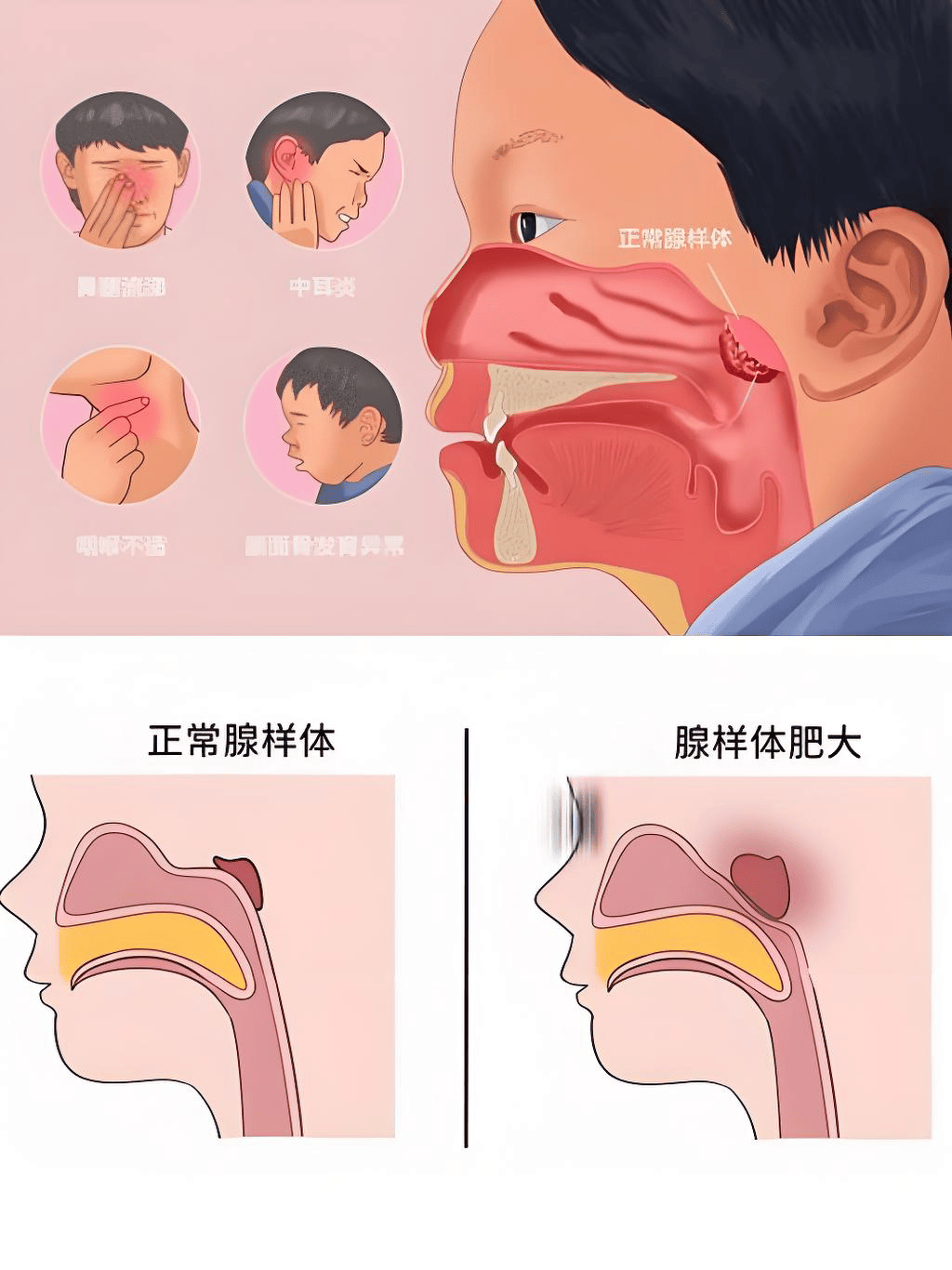 此外,腺样体肥大还可能引发一系列并发症:堵塞咽鼓管导致中耳炎,严重时影响听力;长期用嘴呼吸导致口腔干燥、牙龈炎;呼吸不畅影响心肺功能,甚至增加成年后患上高血压、冠心病的风险。同时,夜间睡眠质量差会让孩子白天精神萎靡、食欲不振,影响生长发育,导致身高、体重落后于同龄人。