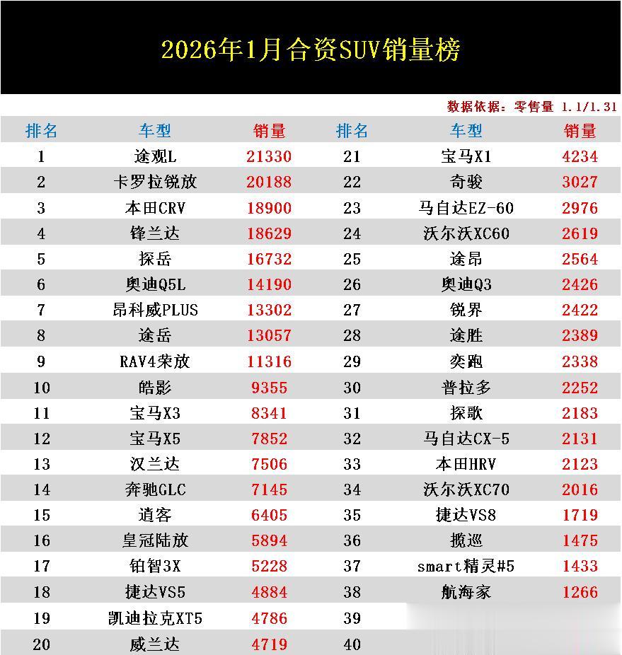 导读:看完乘联会最新公布的1月合资SUV零售量排行榜,感觉这一细分市场的销量较前几年冷清了许多,在上榜的众多车型当中只剩下9款销量超过万辆,自第40名以后各车型月销量更是迅速下降至千辆以下,最让人唏嘘的是,榜单尾部第77名以后高达40多款车型月销量竟然不足百辆,整体表现让人心酸。其中大众途观L以21330辆的成绩拿下榜单头名,丰田卡罗拉锐,本田CRV、锋兰达等日系主流车型携手紧随其后,别克昂科威PLUS销量13302辆,排在第7,是榜单前十中唯一不属于德系与日系品牌的车型。整体来看,随着国产车的崛起,合资SUV市场的销量彻底分化,资源正在往头部车型集中,整个市场只有德系与日系品牌车型在苦苦支撑,其它品牌车型则几乎全线溃败,合资SUV市场正在经历严峻挑战。太惨了!1月合资SUV销量排名:仅9款破万,途观L夺冠,汉兰达第13