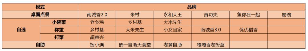 2.自选模式自选模式分为三类,分别是以老乡鸡和乡村基为代表的小碗菜模式,以大米先生、小女当家为代表的称重模式,和以超意兴为代表的餐线打菜模式。