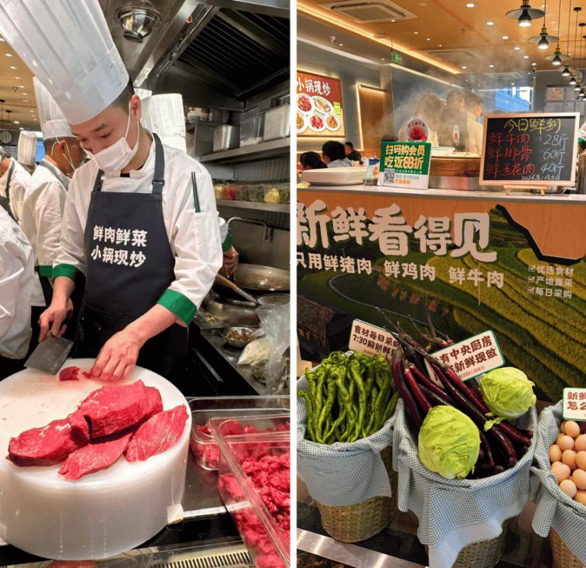 第二,去预制菜化。大米先生专职配备了一名厨师,“鲜肉、现切、现炒”,所见即所得,同时把当日采购的食材放在门前展示,强化“新鲜”理念,消费体验好,建立了差异化的壁垒。
