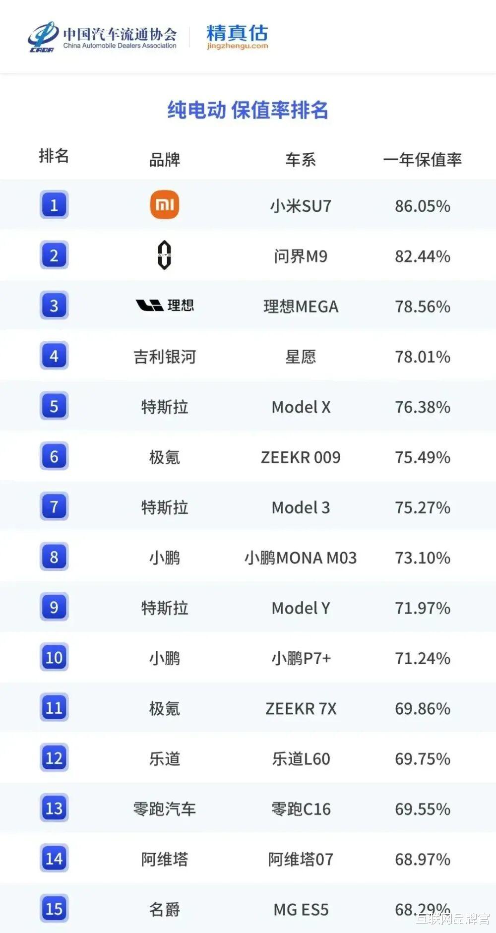 2025年末,中国汽车流通协会和精真估联合发布的《2025年度中国汽车保值率报告》,抛出了一个足以改写新能源行业认知的结论。纯电动车型榜单中,小米SU7以86.05%的一年保值率,斩获年度第一。值得一提的是,这个成绩,刷新了近三年纯电动车型一年保值率的最高纪录,将新势力车型的价值认可度,推上了新高度。
