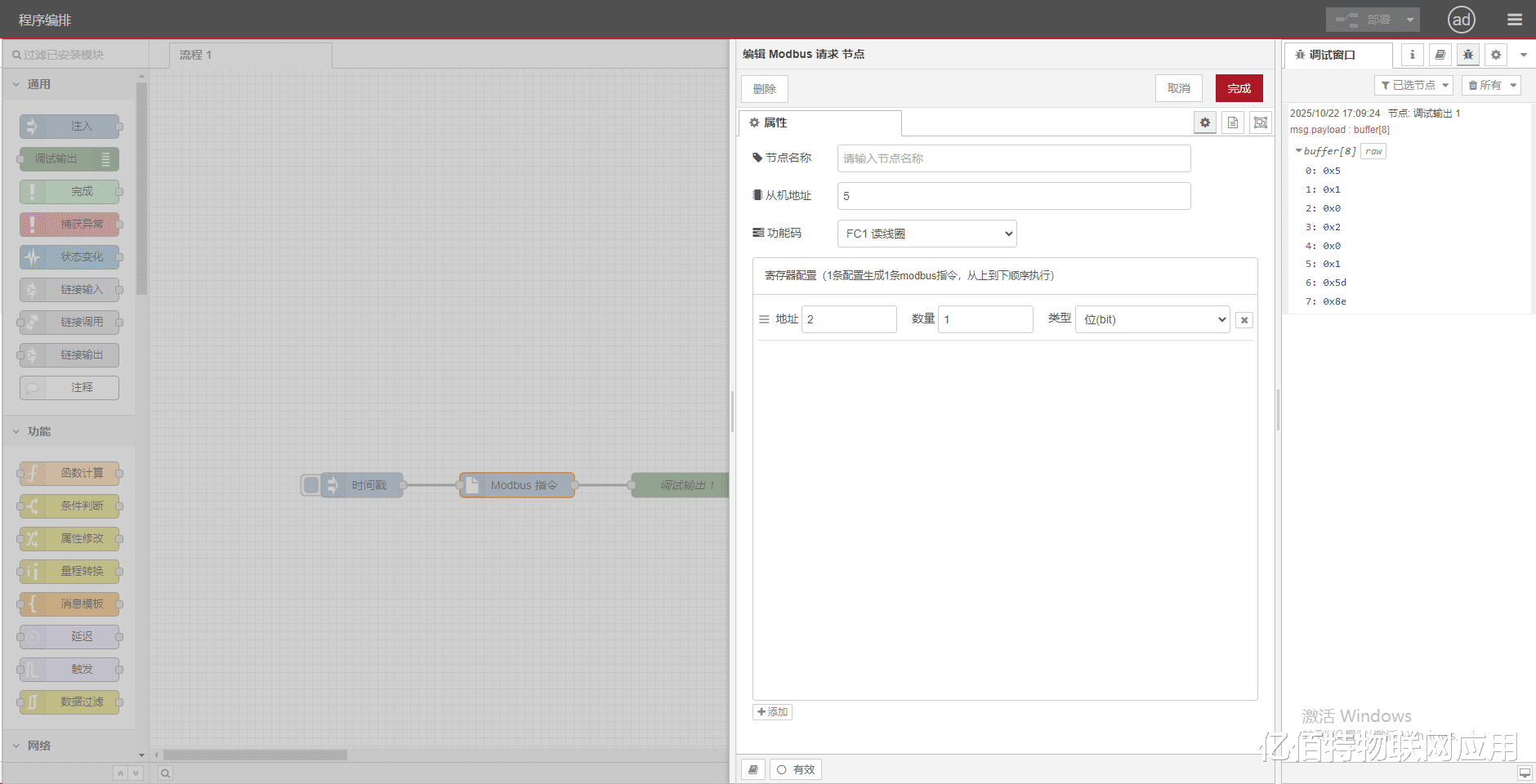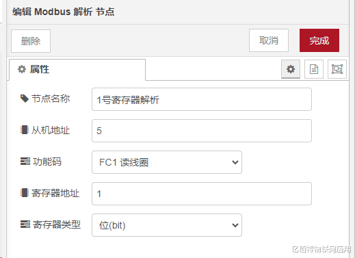 modbus解析节点解析节点主要用于将modbus设备返回的报文加以解释,并且在调试窗口输出,例如读取到的线圈状态,寄存器的内部数据等。