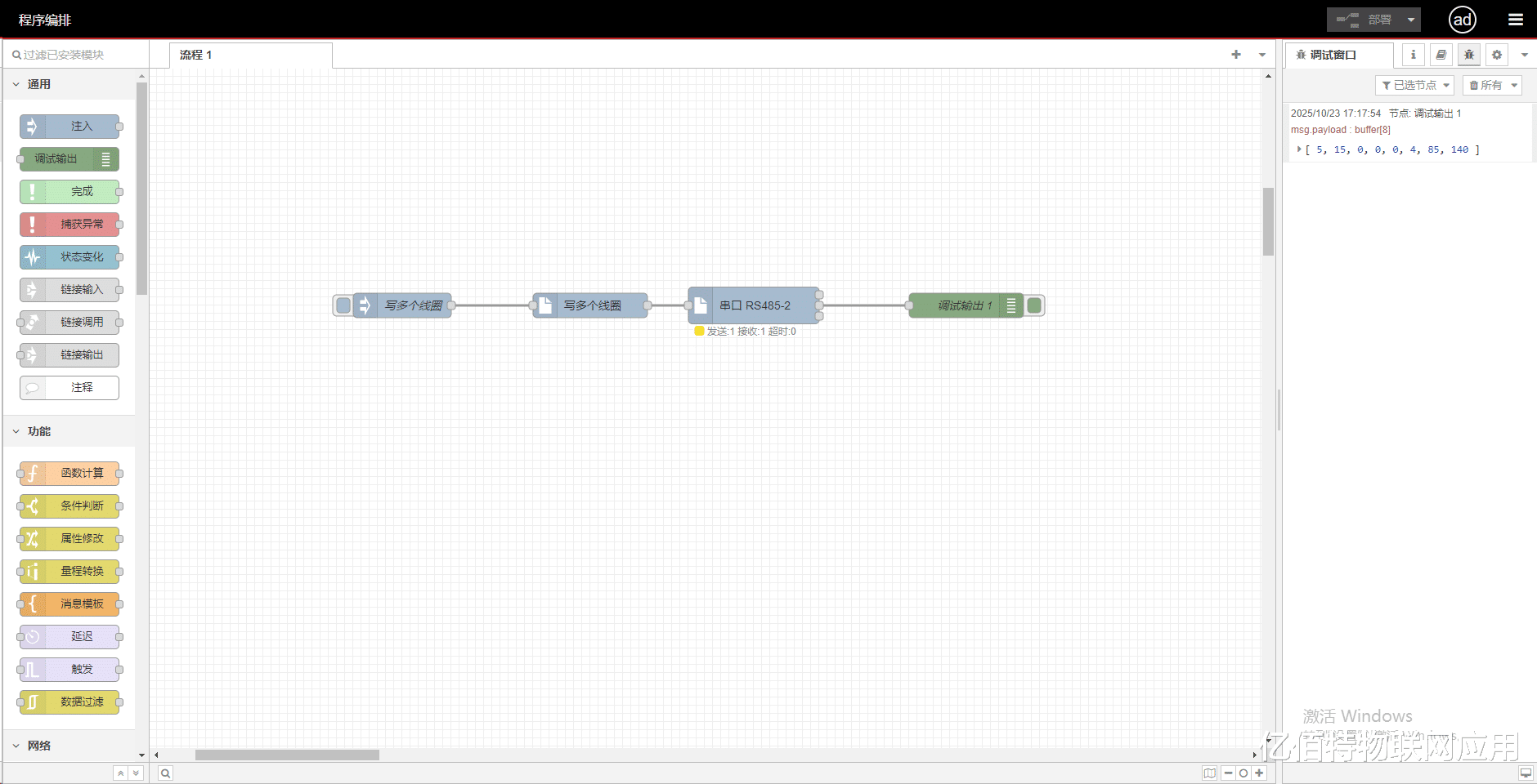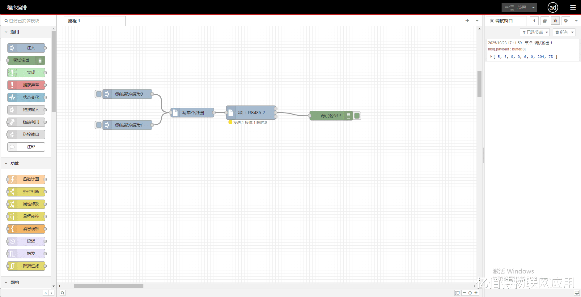 更多用法读取参数的部署方式其实都大同小异,我们来介绍如何写入某些参数。例如我们想要对单个线圈进行写入操作,我们先将modbus请求节点内的功能码修改为5号码,然后填写需要修改的线圈的地址,之后我们就需要使用注入节点向modbus请求节点写入相应的值了:例如0和1。由于我们是写数据所以我们并不需要对返回的数据进行解析,所以只需要将请求节点生成的报文通过串口输入到modbus设备中就行: