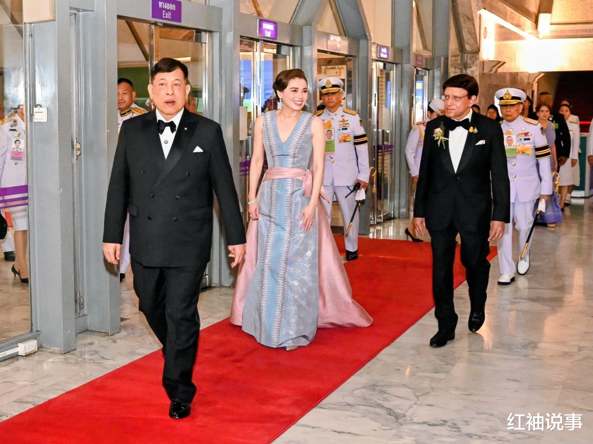 9月23号晚上7点31分,泰王玛哈带着苏提达王后,出现在曼谷怀广区的泰国文化中心啦。他俩是去一起看第27届,曼谷国际表演艺术盛会里的,多明戈音乐会呢。那天苏提达王后穿了一身超美的礼服,一亮相就特别优雅,那王后风范直接拉满,可太有气场啦!