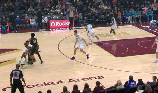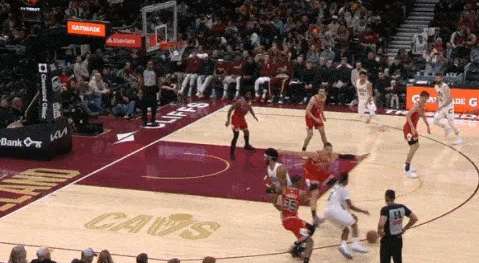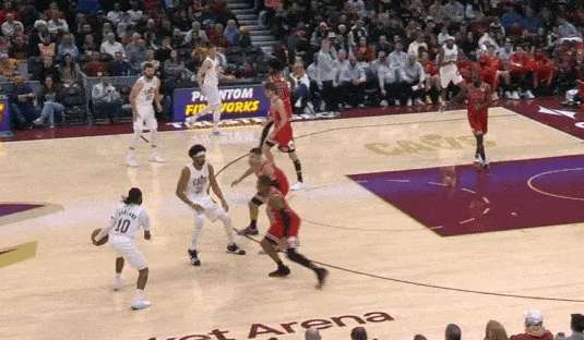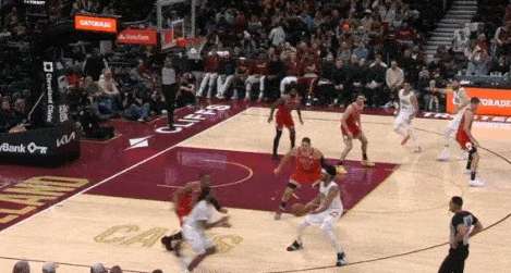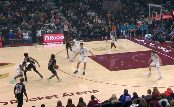 加兰挡拆行进间吸引武器平延误,顺下的阿伦和弱侧沿底线空切的汤姆林进入二打一优势局面。