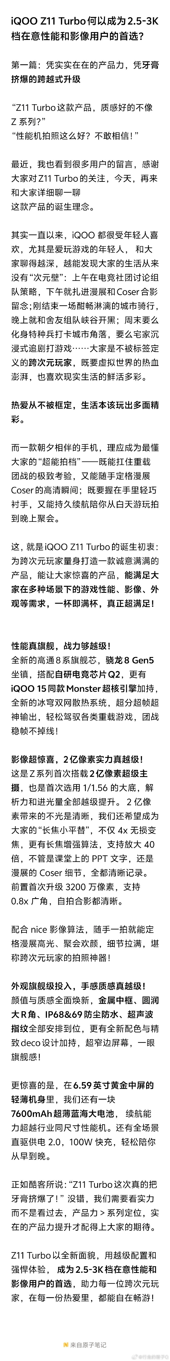 这就是战斗精灵——全面满足大家的不同场景需求,让#iQOO Z11 Turbo#成为2.5K-3K档集强性能、长续航、好影像、高质感于一体的唯一选择!”