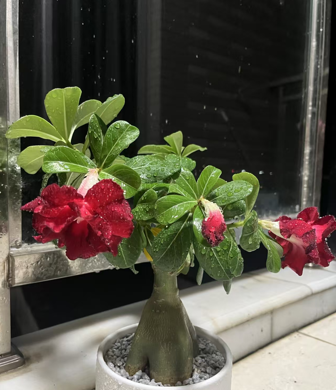 沙漠玫瑰:小浅盆 + 少水,块茎壮成 “老桩”第一次养沙漠玫瑰,看网上养得艳丽,就想让它快点开花,三天两头浇水,结果不到一个月,根部发软、叶片哗哗掉。后来才知道,它跟多肉、仙人掌一样,得 “贱养”。