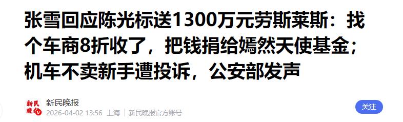 新民晚报《张雪回应陈光标送1300万元劳斯莱斯:找个车商8折收了,把钱捐给嫣然天使基金;机车不卖新手遭投诉,公安部发声》
