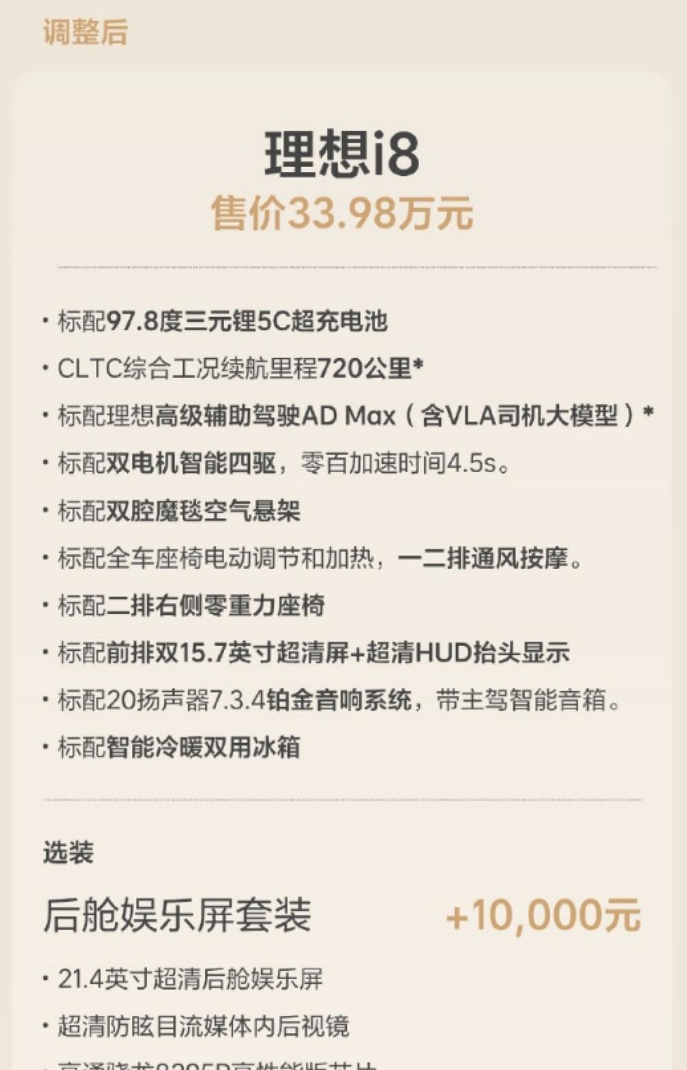 03不过厂商调价动作倒确实快。这不,i8上市刚过一周,理想就官宣调整。照现在的说法,原来的Max现在成了新标配,价格直接从34.98万降到33.98万,还赠1万块钱的铂金音响。要是想后舱娱乐,选装价格也就1万。Ultra原先36.98万,现在能用34.98万拿下原来的全部配置。