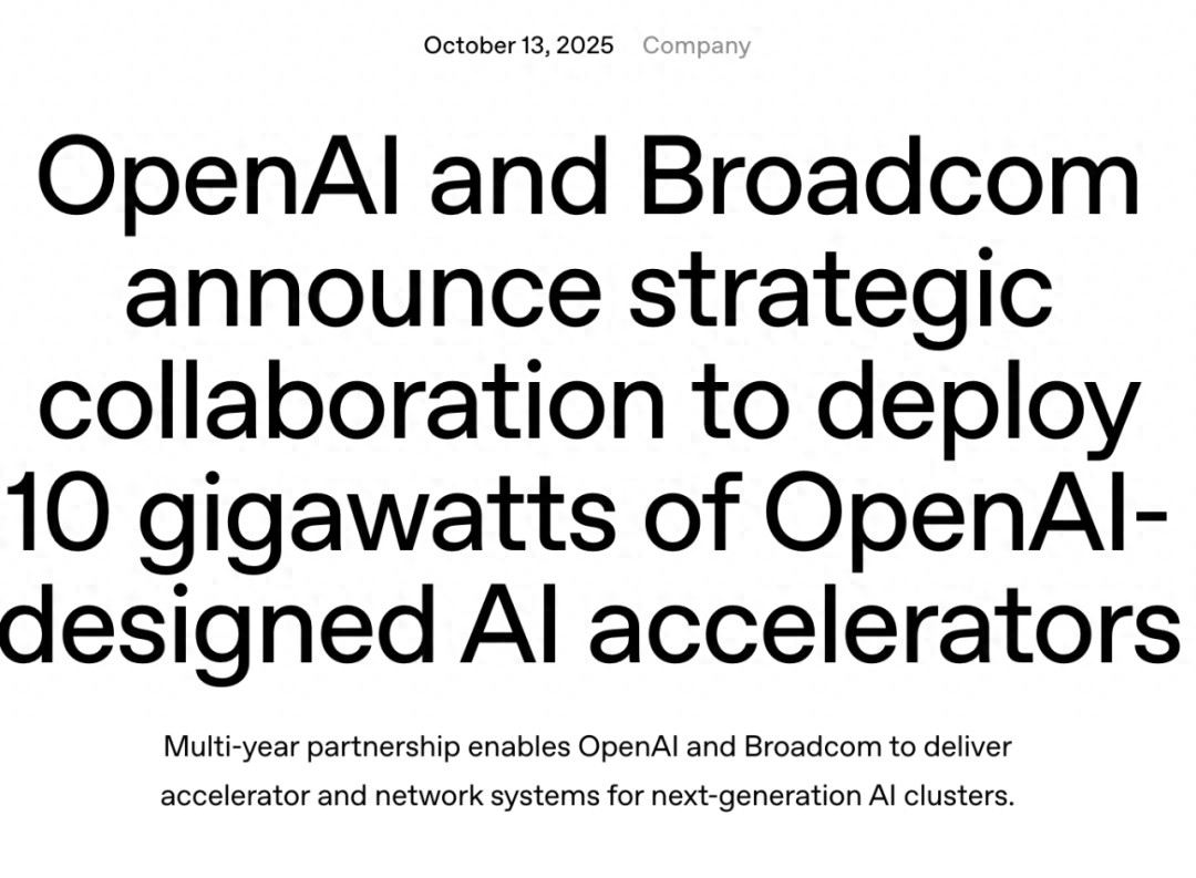 就在与 NVIDIA 和 AMD 相继签署大规模硬件协议后不到一个月,10 月 13 日,OpenAI 又宣布与芯片设计巨头 Broadcom 达成战略合作,双方将共同开发和部署容量高达 10 千兆瓦(GW,Gigawatt)的定制 AI 加速器系统。