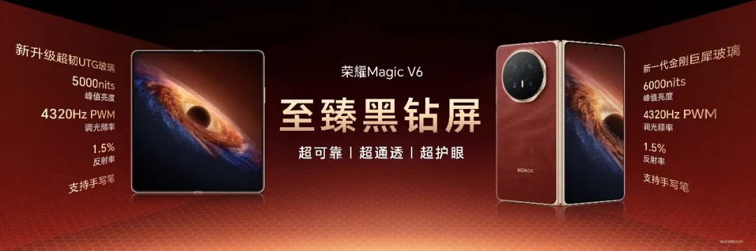 荣耀Magic V折叠屏系列自诞生之日起,就在不断刷新折叠行业品类上限。此次荣耀Magic V6不仅在极致轻薄上持续引领,更首次将折叠屏电池容量带入7000+mAh时代,续航实力跨代领先。内外均采用荣耀自研至臻黑钻屏,国际顶级七大权威认证诠释顶级屏幕素质。全新荣耀盾构钢铰链和超强整机防尘防水,将可靠性拉满。同时,凭借满血性能和出色影像配置,以及全新AI生产力和跨生态互联体验,带来从内核到外观,从硬件到软件的“折叠屏大满贯”实力。