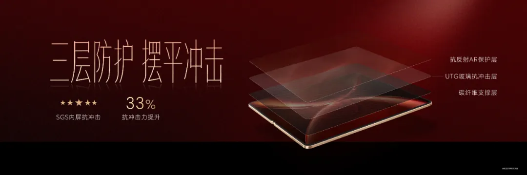 内屏同样有至臻黑钻屏旗舰素质。全新升级超韧UTG玻璃,折痕相比上一代产品改善44%,通过了SGS无感知折痕认证,呈现出仿佛没折的平滑效果。同时,通过碳纤维支撑层、UTG玻璃抗冲击层、抗反AR保护层等三层防护,抗冲击力提升33%,由内到外,可靠属性拉满。