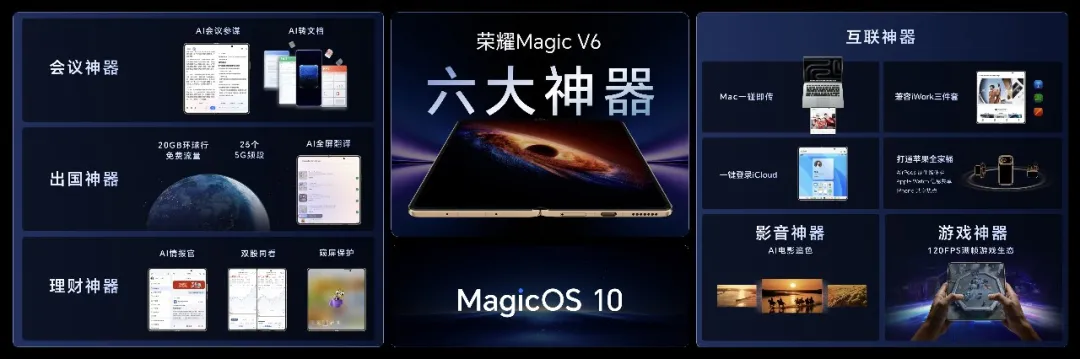 如果说硬件实力决定折叠屏的性能边界,那么AI和生态等软件能力则决定折叠屏的好用程度。此次荣耀Magic V6不仅在硬件创新上实现“全满贯”,在软件配置上也同样能打。荣耀Magic V6带来会议、理财、出国、影音、游戏、互联六大场景的“六大神器”软件体验。