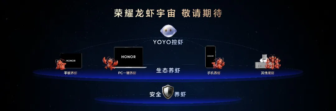 发布会上,还公布了生态级的荣耀龙虾宇宙,支持PC一键养虾、平板养虾,未来还能兼容其他生态设备的龙虾接入。用户可以通过YOYO在荣耀手机上直接和小龙虾交互,并安全地开放手机智能体供小龙虾调用,实现生态养虾、安全养虾和YOYO控虾三大能力。这些功能将于近期陆续开放内测。