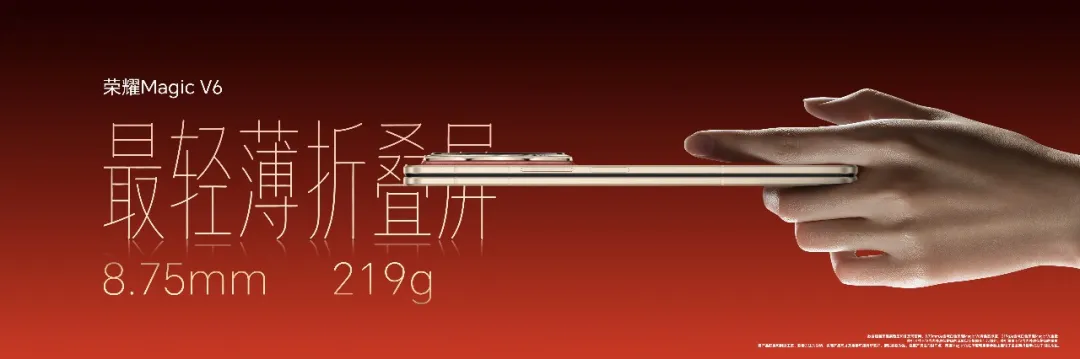 自荣耀Magic V2引领折叠屏进入“毫米时代”以来,轻薄就成为了荣耀折叠的基因。此次荣耀Magic V6折叠形态下薄至8.75毫米,轻至219g,展开状态下的厚度只有4.0毫米,依旧是“最轻薄折叠屏”代名词。