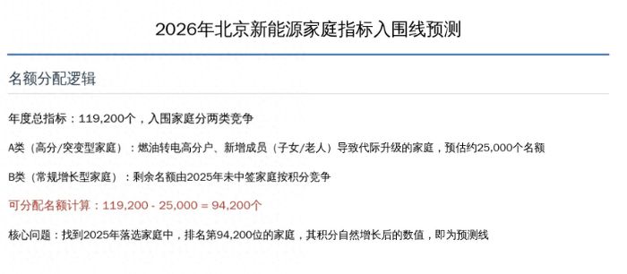加上10万个常规小客车指标,2026年北京市配置的小客车指标总量将达到18万个。 数字够大。随之而来的是另一个问题:2026年家庭指标占比直接拉到了新能源总额的74.5%。这种“倾向性”极强的分配,其实是在给个人赛道和家庭赛道做切割——这已经是两套完全不同的游戏规则了。