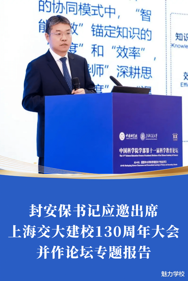 2026年4月8日,上海交通大学庆祝建校130周年大会在闵行校区隆重举行,合肥一中党委书记封安保应邀出席盛典,作为红毯嘉宾走上“2026睿远科技大奖·上海交通大学科学之夜”颁奖典礼红毯,并在相关专题论坛作报告,与海内外嘉宾共贺交大华诞、共话人才培养。