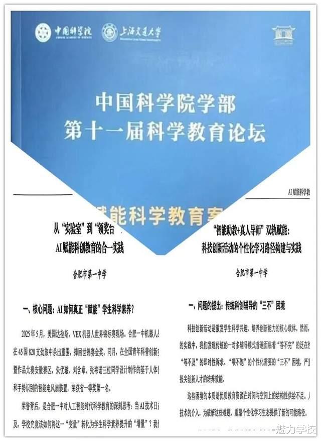 值得一提的是,在本次教育论坛中,合肥一中有两篇学术文章被收录至中国科学院学部第十一届科学教育论坛《AI赋能科学教育案例集》,这充分彰显了学校在教育改革新背景下的学术实力与创新精神。
