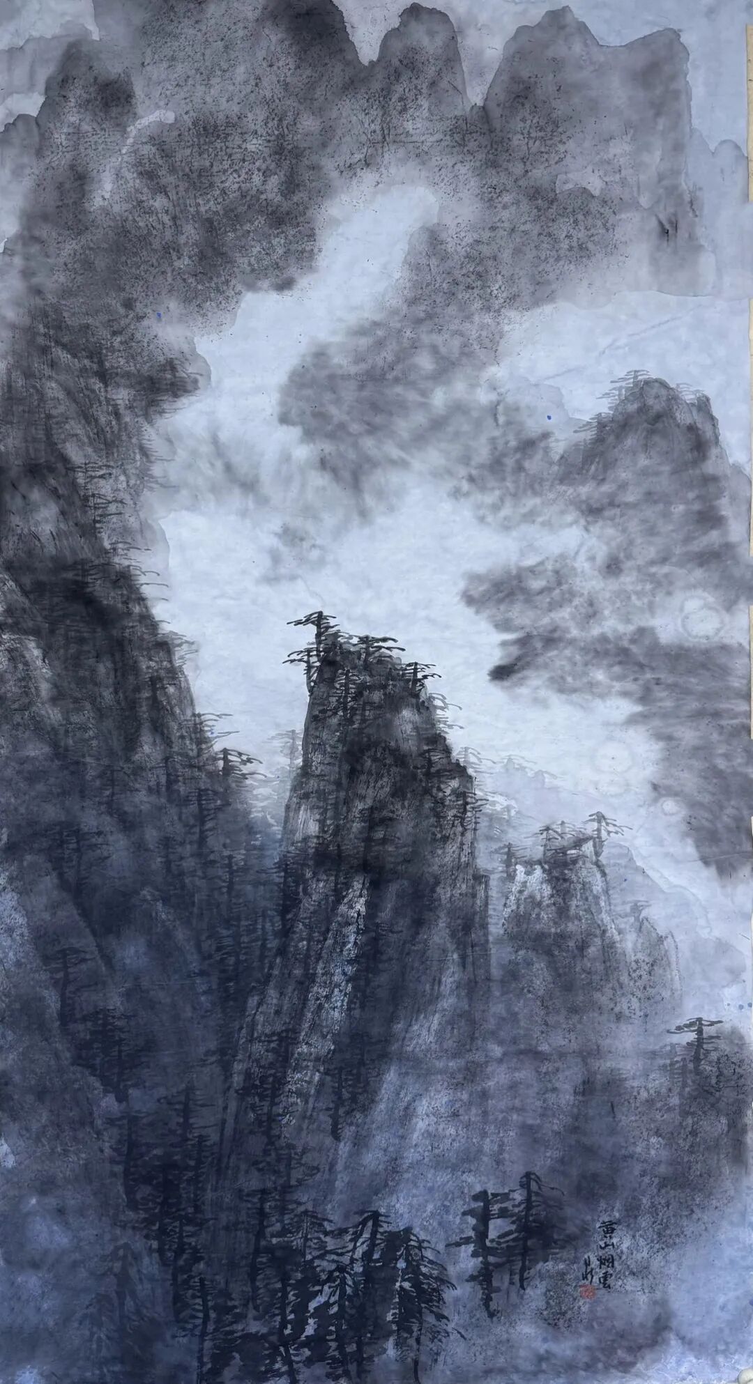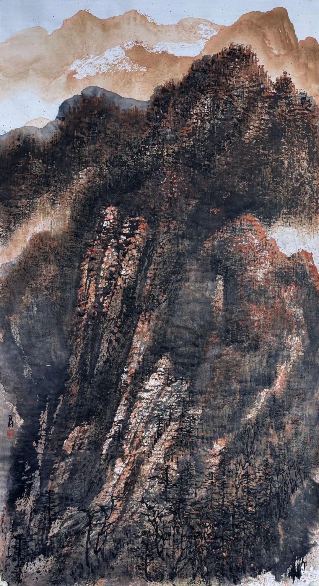 先生之画,首重笔墨语言之当代转译,破古法之囿,立新生之骨。其研五代两宋及元明清宗师笔墨精髓,融斧劈皴之刚劲、披麻皴之细腻于一体,墨分五色,浓淡干湿相生;笔触起落有度,塑山石肌理,显丘峦体积,既存传统苍润厚重,更添现代视觉张力。写林木则简笔勾枝,点叶泼墨相济,嘉木葱茏不失写意之韵,得“守古法而不泥古,出新意而不逾矩”之妙。