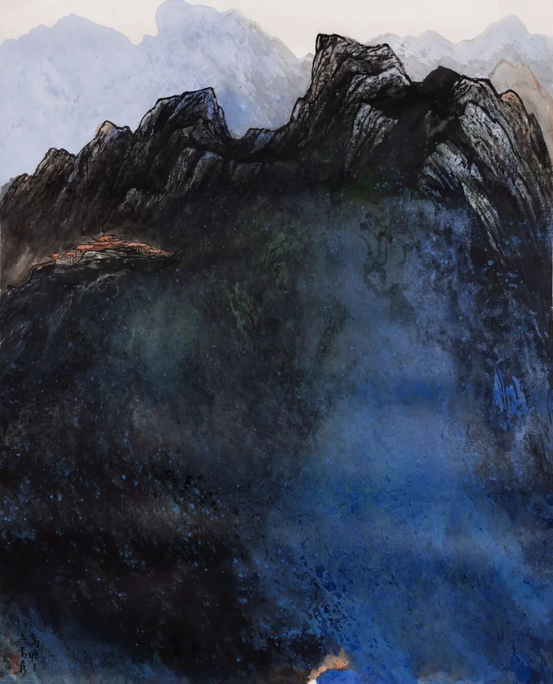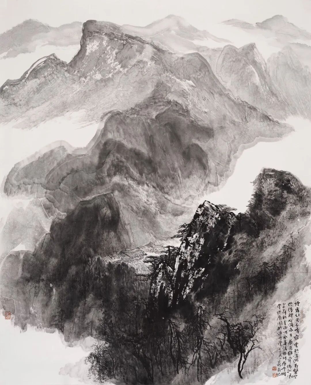 更重中外视野融合,纳四海之观,拓山水之境。构图取传统“三远法”,融西方焦点透视,合国人“游观”审美,具现代视觉纵深;设色破水墨为主之范式,引西方色彩对比理念,冷暖相济,既保传统雅致,又增视觉冲击。其探索不生硬牵强,令画作葆华夏文化基因,亦为国际艺坛所赏。