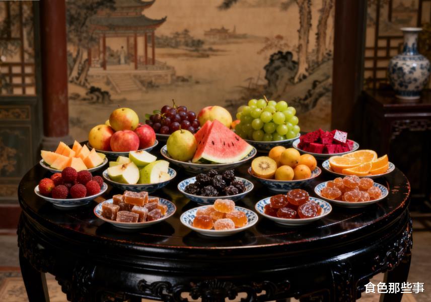 八果罍上,香圆、真柑、石榴、枨子、鹅梨、乳梨、模楂、花木瓜错落有致;缕金香药中,脑子花儿、甘草花儿、朱砂圆子散发着阵阵幽香;雕花蜜煎更是一场视觉盛宴——雕花梅球儿、蜜冬瓜鱼儿、雕花金橘、青梅荷叶儿,每一件都堪称食品雕刻的杰作。