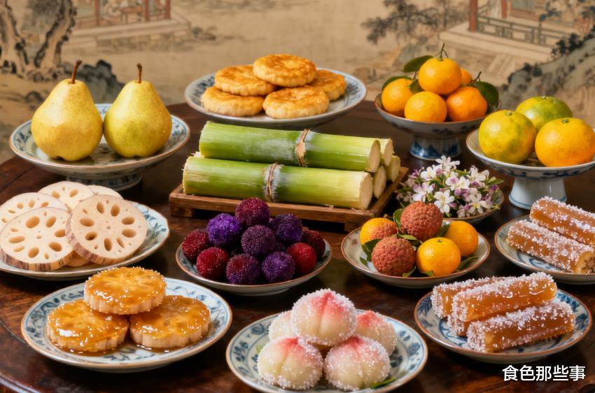 果品既有春藕、鹅梨饼子、甘蔗等切时果,也有金橘、葳杨梅、榆柑子等时新果子,此外还有荔枝甘露饼、荔枝蓼花、荔枝好郎君、珑缠桃条等珑缠果子(在干鲜水果外裹麦芽糖或糖霜之类)。