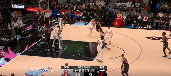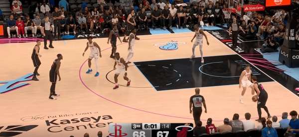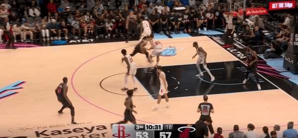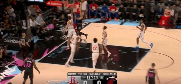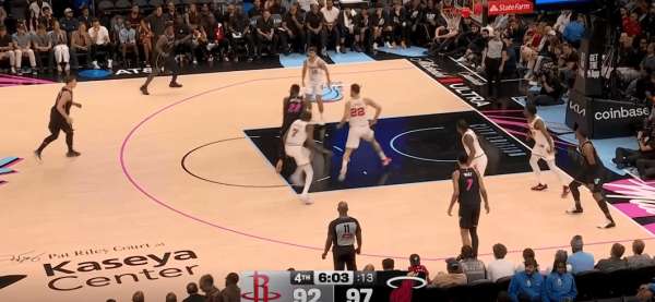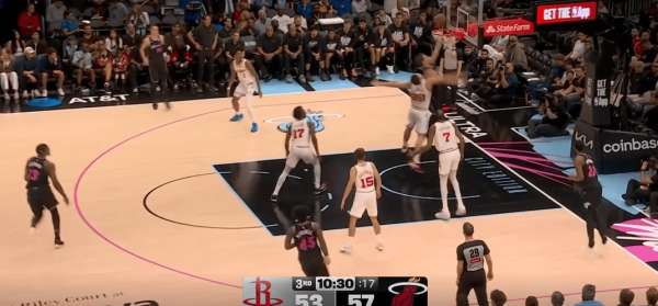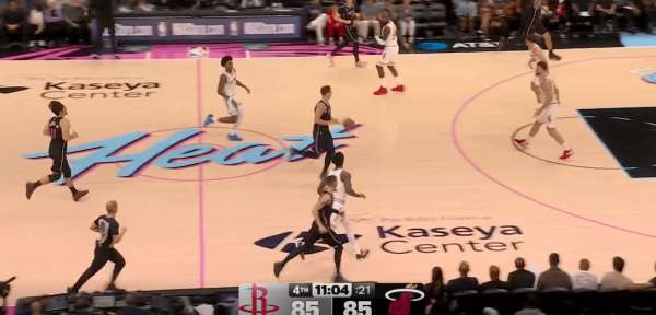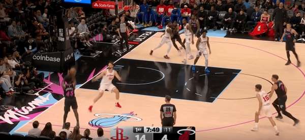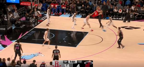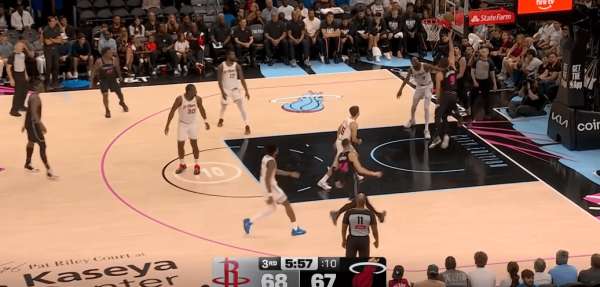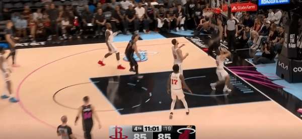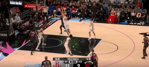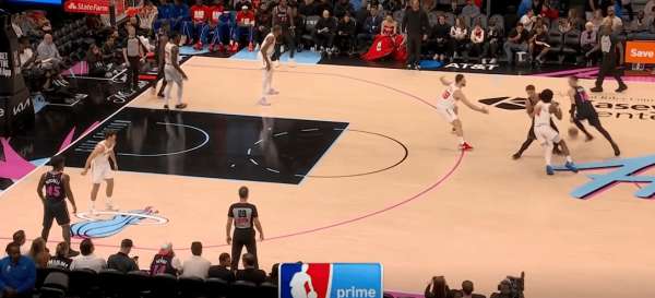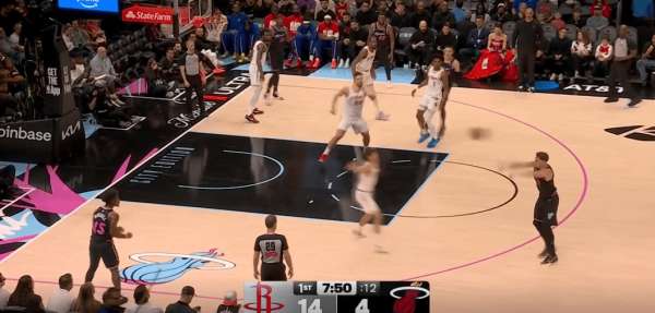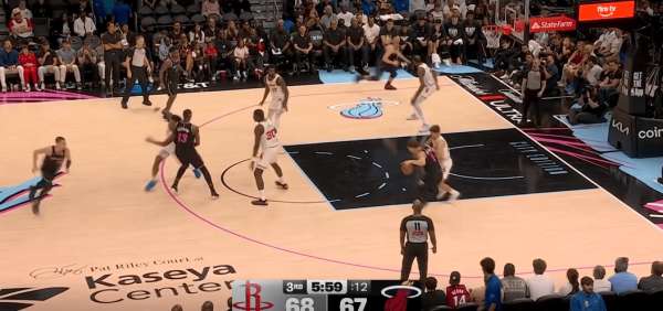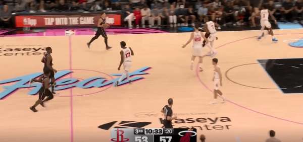 拉尔松把申京带到弧顶为希罗做有球掩护,随后利用申京延误希罗快速外弹,接到球后面对谢泼德的补位快速转移底角米切尔命中三分: