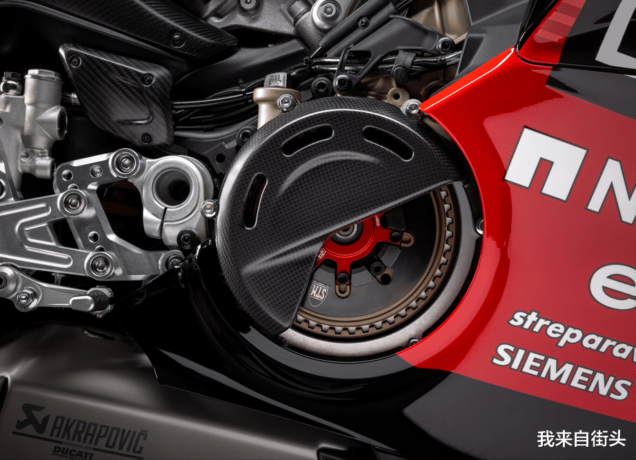 不止如此,在这台顶级限量版车型上,杜卡迪还为其配上了MotoGP级别的STM-EVO SBK干式离合,338.5mm超大Brembo T-Drive刹车碟搭配Brembo GP4 Sport组成的Brembo Pro+刹车系统,Akrapovič homologated轻量化排气、来自Öhlins的顶级避震系统DES 3.0、全碳纤维轮圈、专属 Alcantara坐垫以及大量碳纤维车体套件。