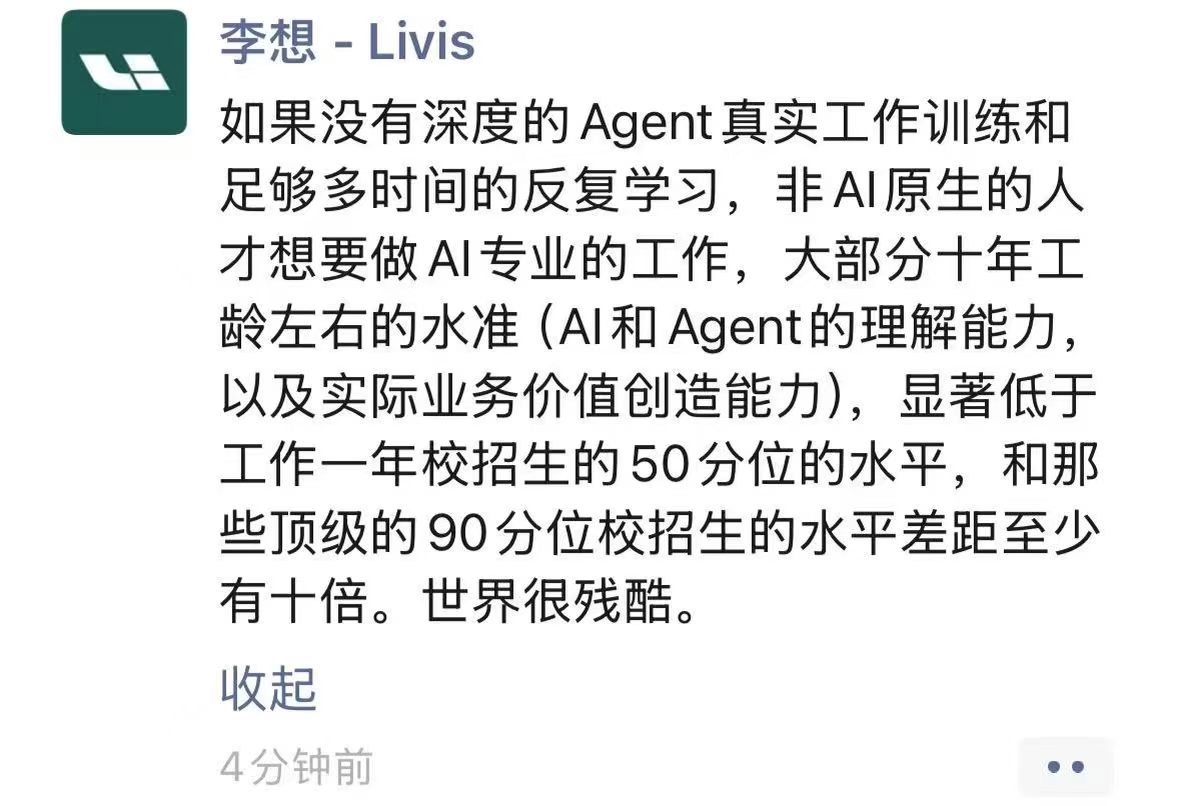 随后,李想再次发布朋友圈补充道,如果没有经历深度的Agent真实工作训练和长期反复学习,大部分拥有十年左右工龄的“非AI原生”人才,在转向AI相关工作时,对于AI和Agent的理解能力,以及实际业务价值的创造能力,可能显著低于工作仅一年校招生的50分位水平,与顶级90分位的校招生相比,能力差距可能高达十倍。李想最后感慨道:“世界很残酷。”