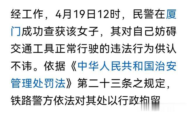对此,女子阻止高铁关门的行为处理结果出来了,女子在厦门被找到,也承认了自己的行为造成的影响,女子目前已被行政拘留。