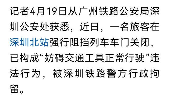 大快人心!女子阻止高铁关门最新后续来了,目前女子已被深圳铁路警方行政拘留,已构成“妨碍交通工具正常行驶”违法行为。事件更多细节曝光,乘务员面对这样的突发事情处理不来恐怕也免不了受处罚了。