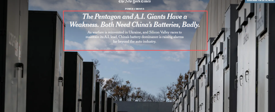 让人没想到的是,看似普通的电池也能成为一种关键的战略资源。在纽约时报看来,电池在中美竞争的两大核心领域占据着不可或缺的关键地位。