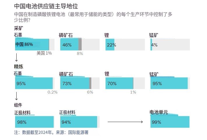 今年2月,谷歌公司表示,它们的数据中心已经安装了超过1亿块电池。微软也表示将用电池代替不环保的柴油发电。而美国这些关键领域所需要的电池,大多数都依赖中国。因为中国主导了全球的电池产业,在规模上和技术上都遥遥领先。从规模上看,根据国际能源署的数据,2024年,中国制造了全球99%的LFP电池和90%以上的主要组件。这种优势延伸到锂和石墨等原材料的提炼,以及驱动电池内电子运动的阴极和阳极等基本组件。也就是说,中国的这种规模领先,是全产业链的领先,从源头上都领先,其他国家要和中国竞争,就必须在全产业链上竞争,难度大大增加。从技术上看,电池技术看似简单,但一旦上规模,这里面微小的技术差异,就足以形成主导和领先的技术和市场优势。例如中国在锂离子技术、石墨阳极、阴极方面的领先技术,足以进行出口管制,国外要自己研发,至少需要五到十年的时间。这还怎么玩?本来已经落后,如果研发还要这么长时间,黄花菜都凉了。