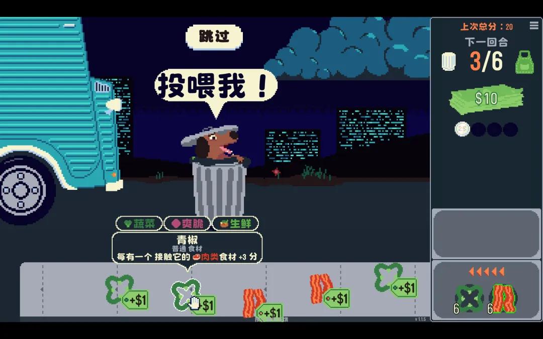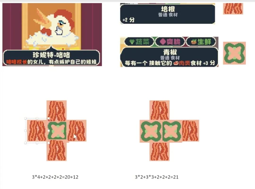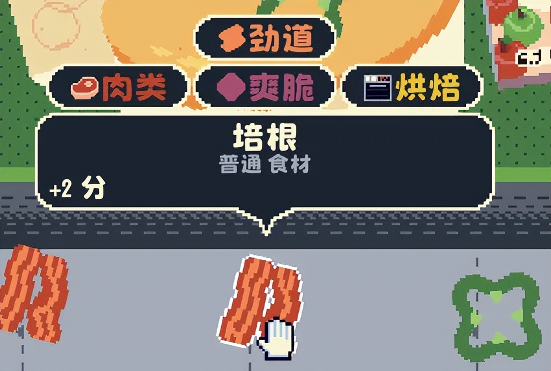 培根本身的分值是2分,青椒本身没有分值,但能够让每个接触它的「肉类」加3分。食材之间的这种协同关系,就是整个构筑系统的基础。