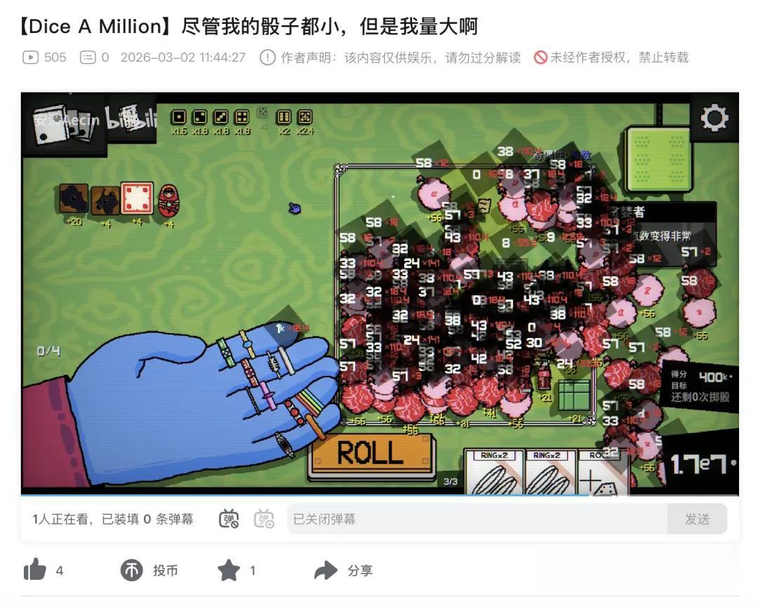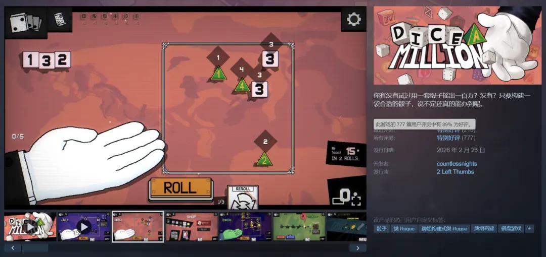 2026年2月发售的《一掷百万(Dice A Million)》给出了回答。这款产品首月销量超4.5万套,开发者本人在社交媒体上直言「我在做骰子版小丑牌(I'm making dice balatro myself)」。